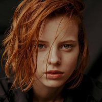 The picture shows a young woman with red hair. She appears to be looking directly at the camera, and her expression is neutral. The lighting in the photo seems soft and warm, giving it a gentle atmosphere.