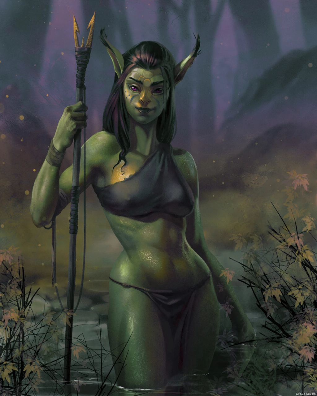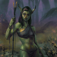 green skin and pointed ears characteristic of elves, and she is wearing a loincloth or leotard that suggests a jungle or wilderness setting. She is holding what looks like a spear or staff, further indicating a theme of action or combat in the image. The background includes misty trees and foliage, which adds to