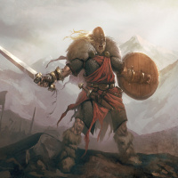 an ancient civilization, likely representing a scene from Norse mythology or the Viking Age. The character is shown wielding a sword and wearing armor with a helmet and a cape, which are characteristic of