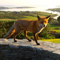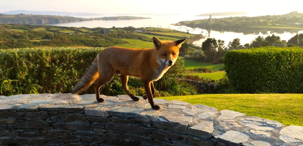 The image shows a fox standing on top of what appears to be an old stone wall or ruins with