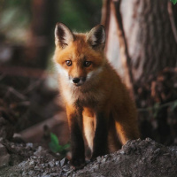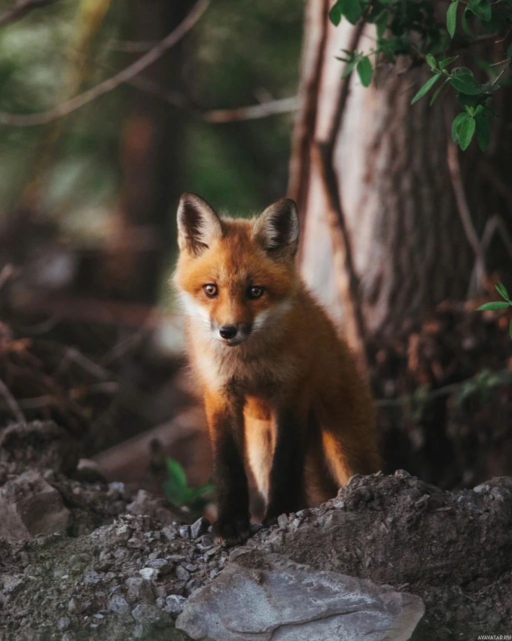 На картинке изображена лиса, стоящая на каменистой почве, окруженной растительностью. У лисы красновато-коричневый мех, характерный для этого вида. Она сосредоточенно смотрит в камеру.