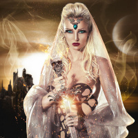 blonde hair and is wearing a headpiece with a central jewel. Her makeup appears dramatic, enhancing her eyes and lips to give a powerful or intense look. The woman holds a sword in one hand and what seems like