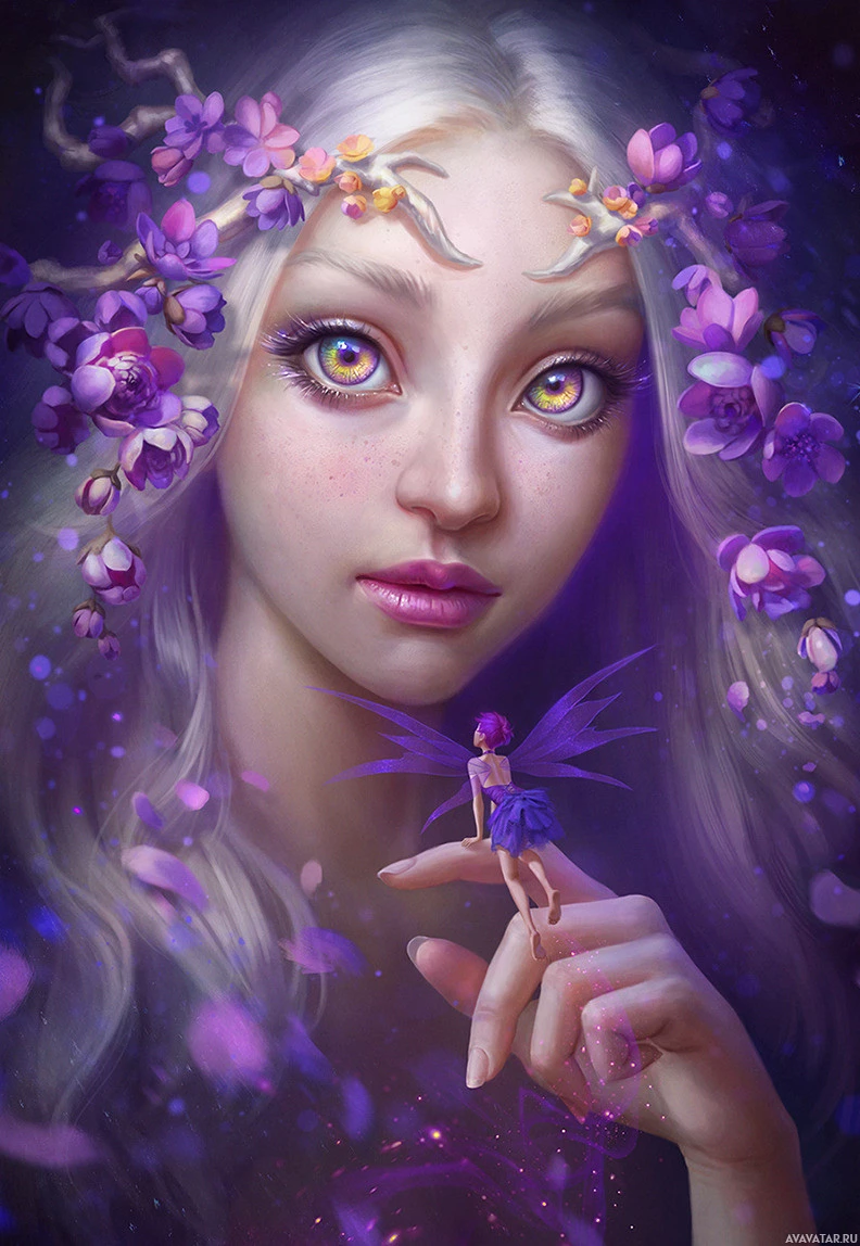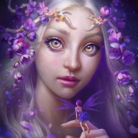 the mystical atmosphere. The girl's hair is adorned with flowers that resemble violets, further enhancing the fairy-like theme of the artwork. The use of