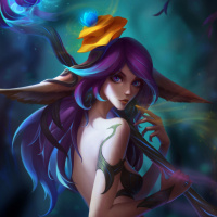 the dark forest surroundings, suggesting a connection with nature or possibly being a guardian of the woods. In her right hand, she holds a staff adorned with flowers, which might indicate a role as a healer or a protector in