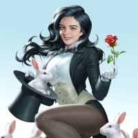 white bunnies that are appearing around her feet. This illustration appears to be inspired by the DC Comics universe and captures the essence of Zatanna's