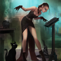 mystical activity. The girl has her hand extended towards what looks like a book or a journal on a table before her, and she seems to be looking at it with concentration. A cat is present in the scene, sitting near the bottom left corner of the image. It appears to be attentively watching the girl's actions. The room has an old-fashioned or medieval look to it, with a staircase leading upwards and a candle on