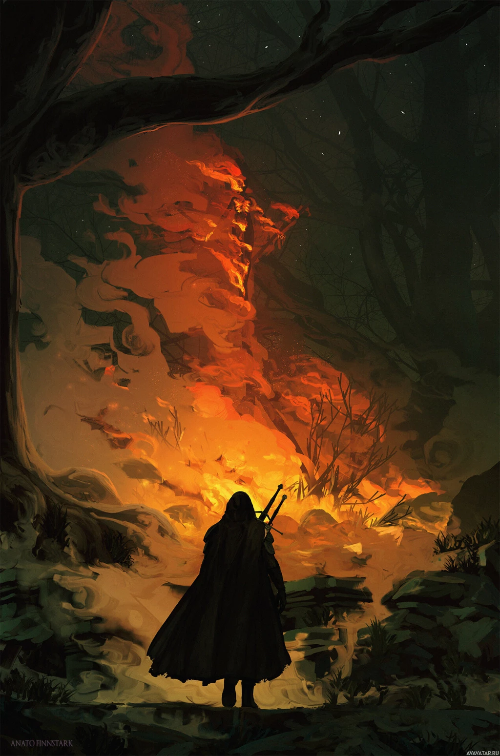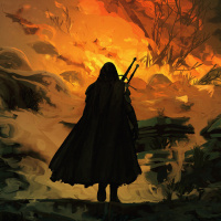 Geralt of Rivia, the protagonist from "The Witcher" series. He is depicted in a silhouette form against a forest background at night with orange-