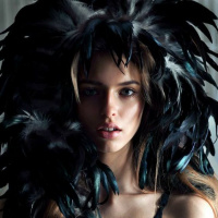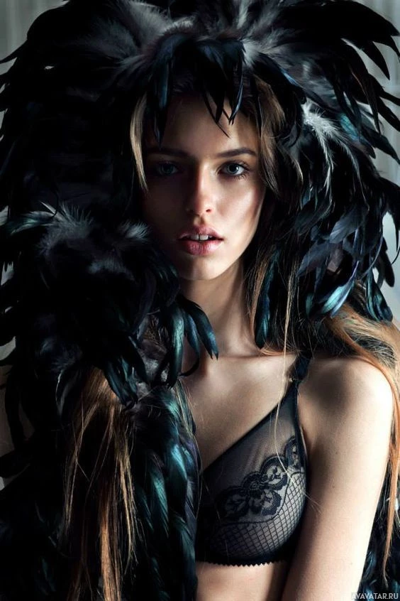 The image features a woman wearing feathers around her neck. She has an expression that could be interpreted as contemplative or intrigued. Her attire includes what appears to be a lingerie style top with visible bra straps and