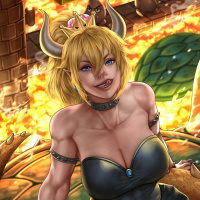the Mario series and Peach (Toadstool) from the Super Mario Bros. games. She is depicted with elements of both characters' appearances: Bowser's