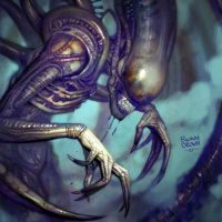 a dark background that suggests an underground or extraterrestrial environment. The artist's signature can be seen at the bottom of the image, indicating who created this piece.