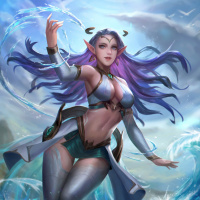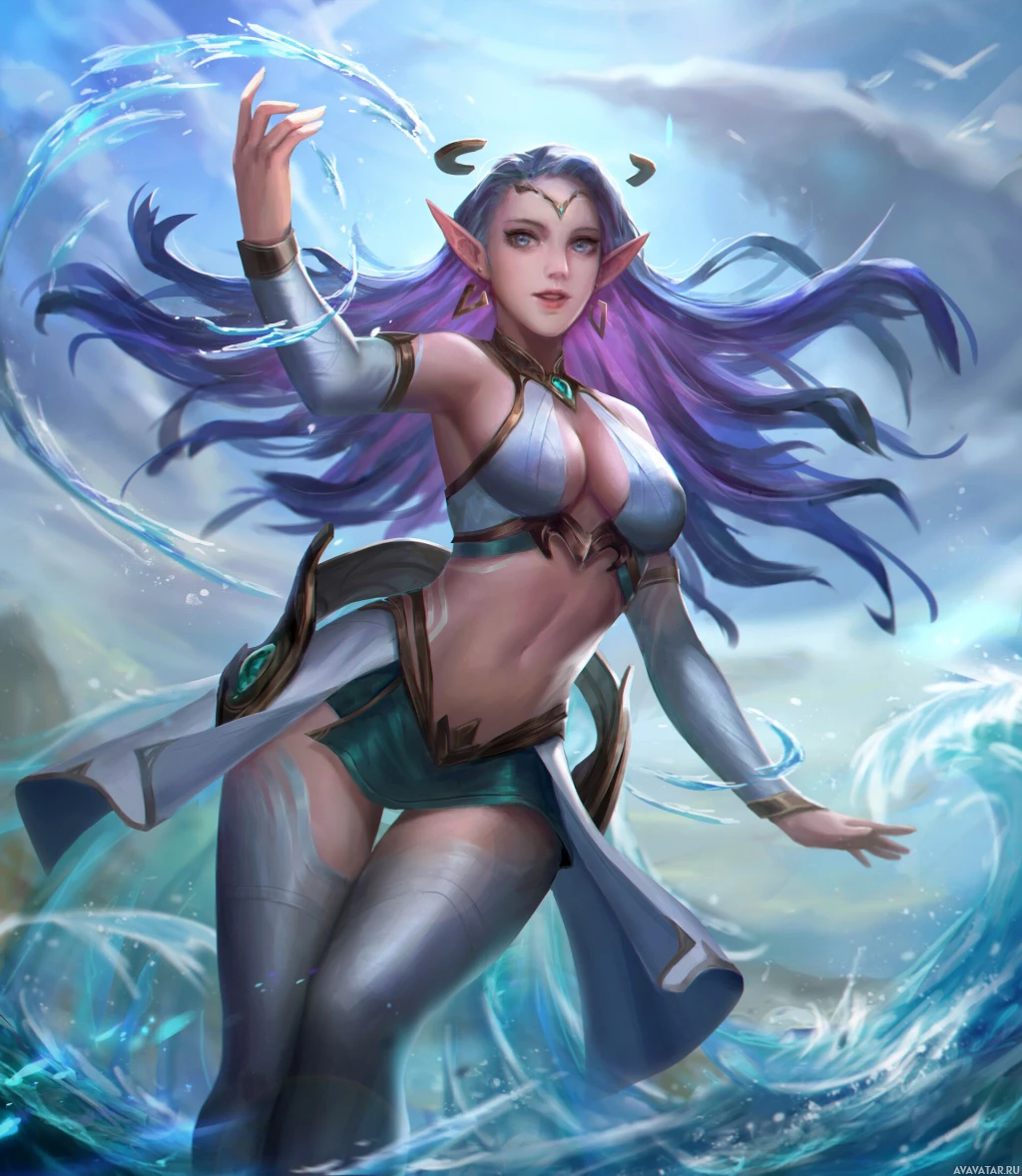 purple hair and pointed ears. She is depicted in a fantasy style, standing on what seems to be water with her right hand extended as if she's casting a spell or performing some sort of