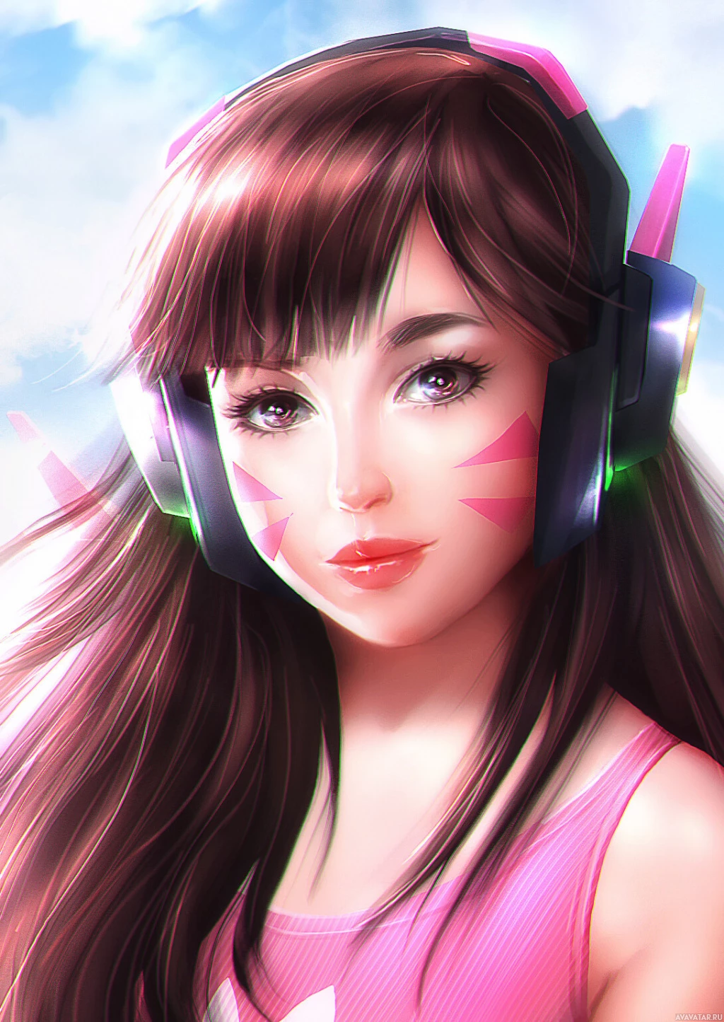 На картинке изображен анимированный персонаж, похожий на D.Va из видеоигры Overwatch. На ней розовый наряд и ее фирменная прическа в виде двух хвостиков. Персонаж также изображен с большими яркими наушниками, которые являются частью ее игрового облика, когда она использует их для общения со своими товарищами по команде.