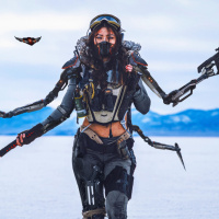 The image features a person dressed in futuristic or