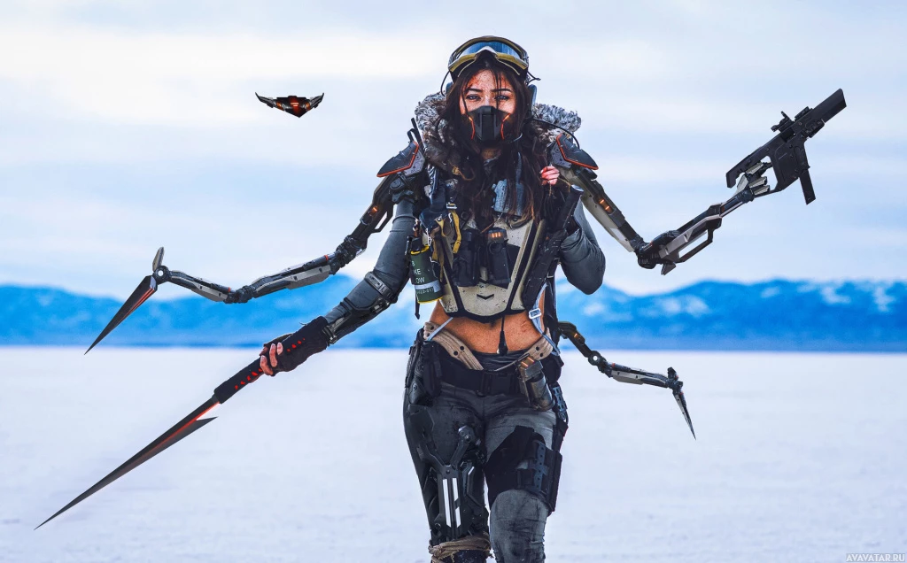 science fiction-inspired attire, likely portraying an action heroine or a character from a dystopian setting. She is equipped with various