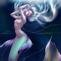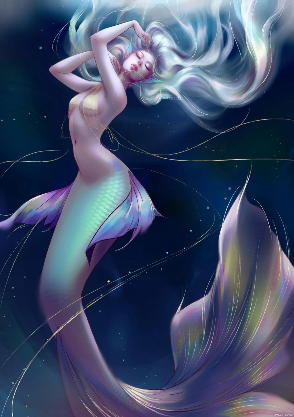 white hair and a tail that appears to be iridescent or multicolored. The mermaid is depicted in