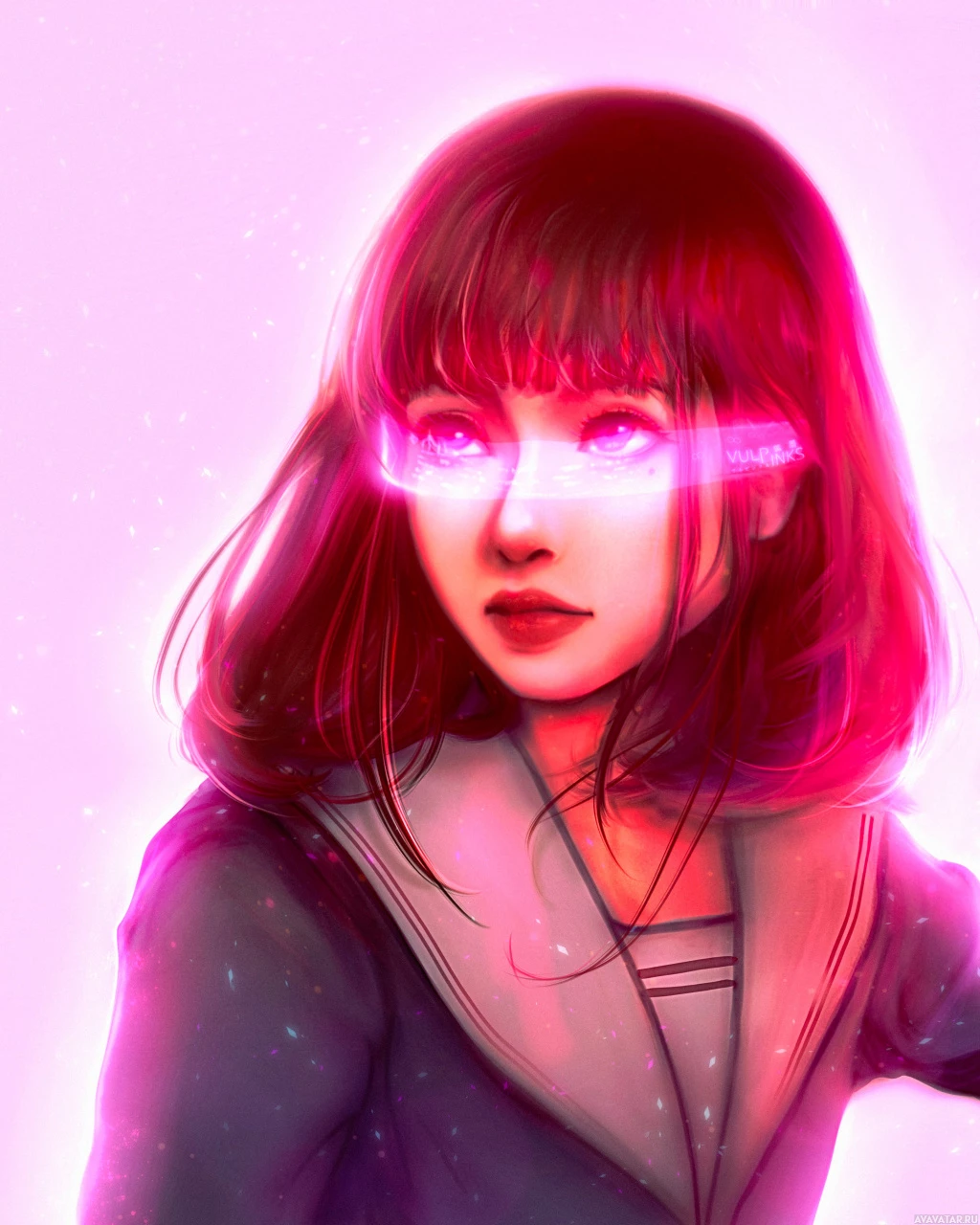 graphic novels and manga. The character has futuristic or cyberpunk elements, such as glowing eyes and what looks like a digital interface on her face, suggesting she may have some form of