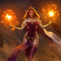 a hooded cloak or cape and holding a pair of fiery torches aloft in each hand. The background suggests