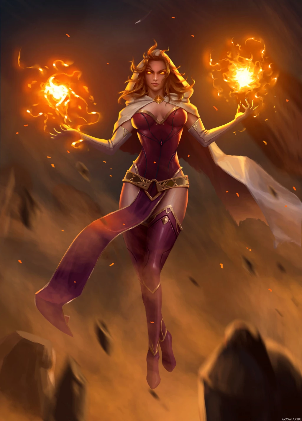 a desolate landscape with rocks and dust. This character embodies the theme of fire and fantasy, likely representing strength, magic, or perhaps