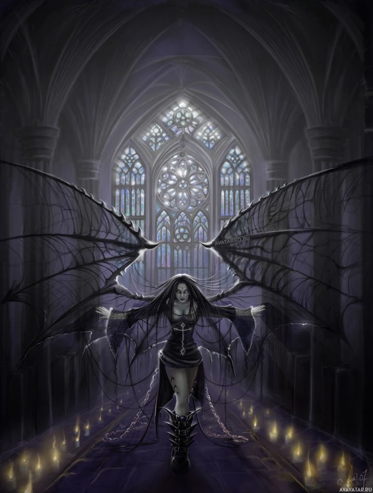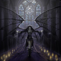a mythological creature known as a succubus, which are often associated with temptation and seductive power in various folklore traditions. The setting looks like an old church or cathedral with tall windows and Gothic architecture, giving the image a somber or