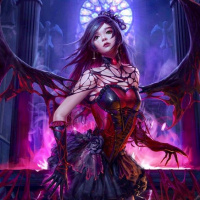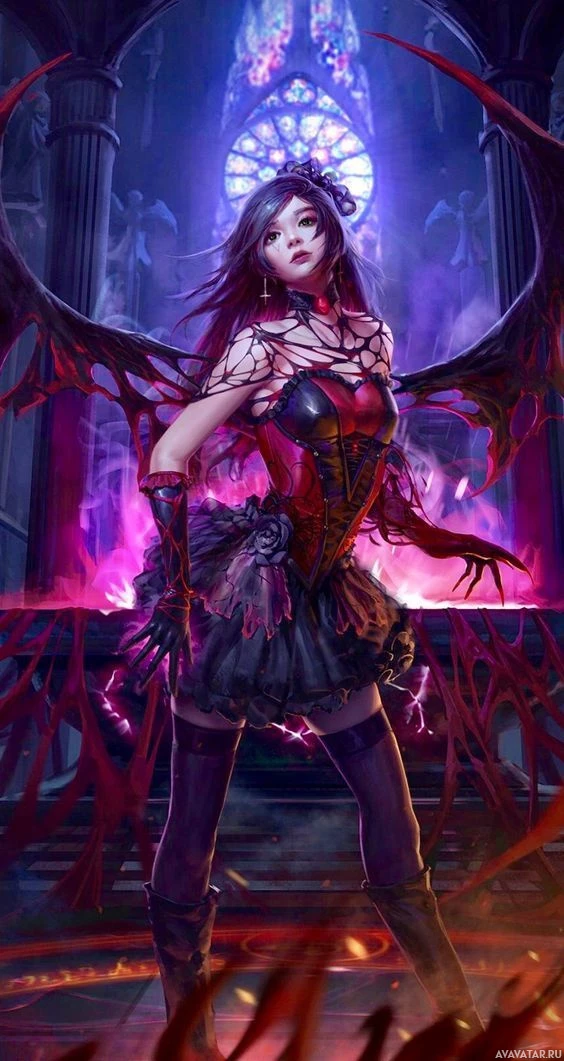 The image shows a fantasy-themed character, often referred to as a succubus, depicted in a stylized and artistic manner. She has long