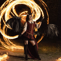 lit background. There are flames visible on the ground around her, indicating that she may be performing
