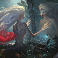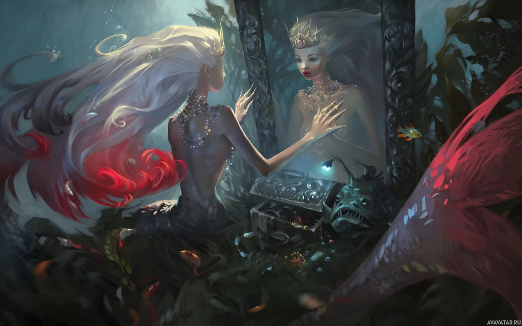 a fantasy scene with a mermaid and a woman. The mermaid, characterized by her white hair and fish tail, is shown with