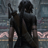 dark hair in a ponytail, wearing what appears to be armor and carrying a sword on her back. She is standing against a backdrop that suggests an urban or industrial