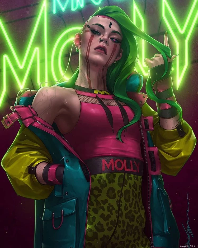 green hair and striking red accents, suggesting a futuristic or alternative style. She is wearing a brightly colored outfit consisting of a pink top, leopard print pants, and