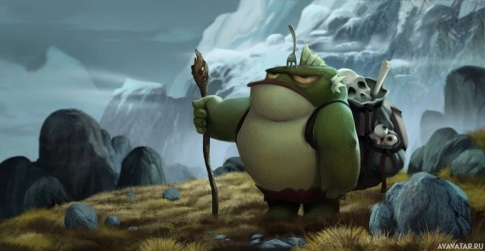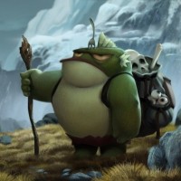 grumpy expression on its face. It is carrying a bag or sack that might contain supplies for a journey or adventure. The overall style of the image suggests it could be from an animated movie or television show set in