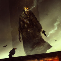 a hooded cloak, giving him an ominous appearance. Below him are two birds, one perched on a piece of rubble and another flying overhead, adding to