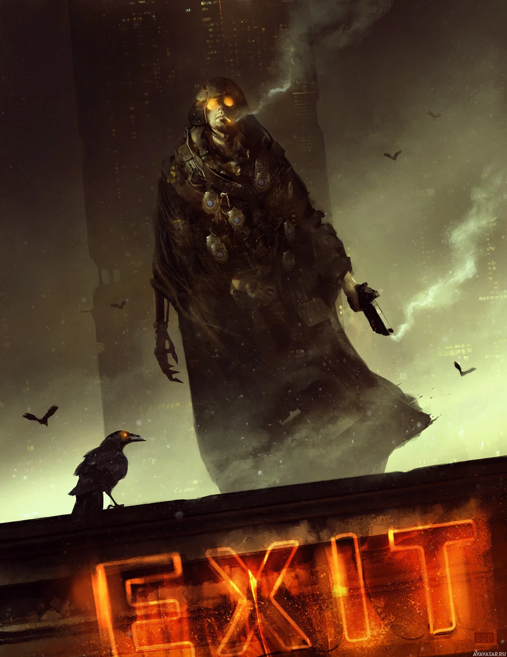 towering structures under a grim sky, and there's a sign that reads "EXIT" prominently displayed. On the left side, there is a character holding a pistol, suggesting conflict or danger. The overall atmosphere is one of decay and potential violence.