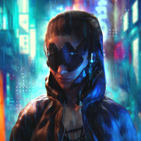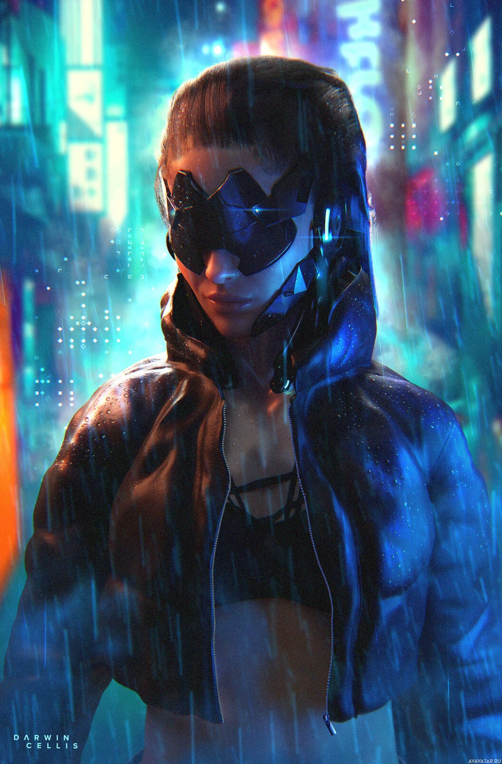 a leather jacket over a bare torso, with what appears to be some kind of cybernetic enhancement or prosthetic on one side of her face. The character stands confidently against the backdrop of a neon-lit urban