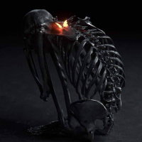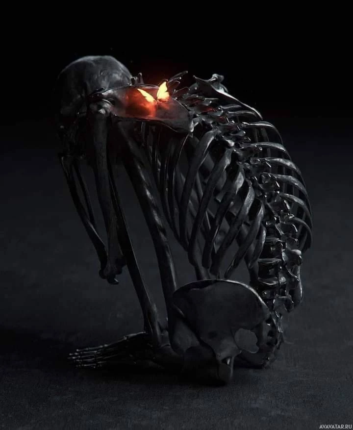 a humanoid figure, resembling the shape and structure of an human skeleton. It is placed against a dark background which highlights its