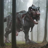 The image shows a creature resembling a zombie-like version of a Tyrannosaurus Rex, standing amidst misty,