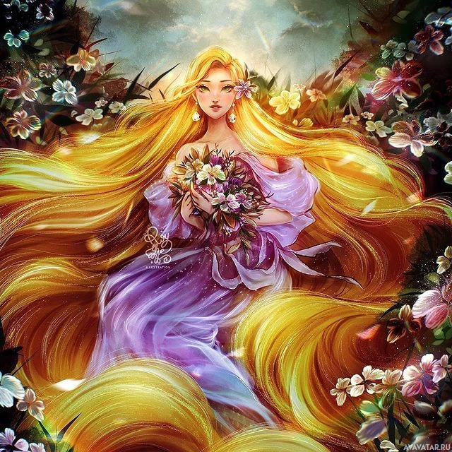 a flowing skirt, suggesting movement, and has flowers in her hands. The background is adorned with various floral elements and what appears to be a light source from the top left corner, giving off