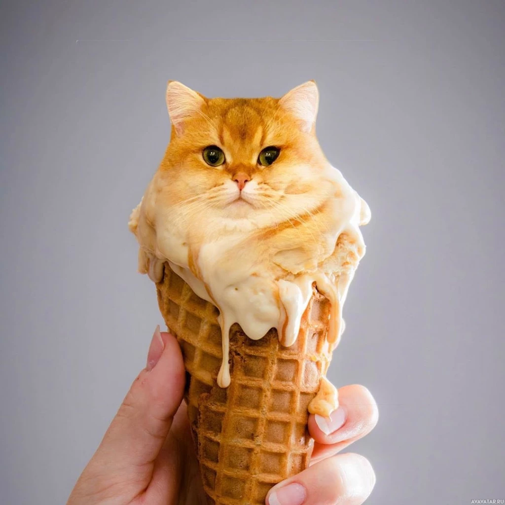 an ice cream cone containing what appears to be an animated or digitally altered cat. The cat's body has been transformed into the shape of an ice cream cone, and it is positioned within the actual ice cream cone as if it were a cat in a real-world scenario, being held by