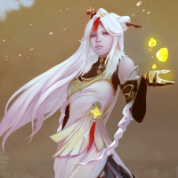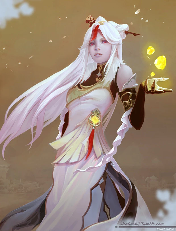 white hair and a magical appearance. She is depicted in a stylized manner, wearing what seems to be fantasy or mystical clothing, and she has