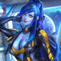 a female character with blue hair, wearing futuristic or cyberpunk-inspired attire. She is dressed in black and yellow