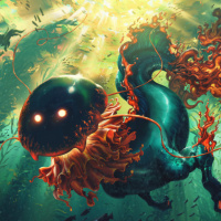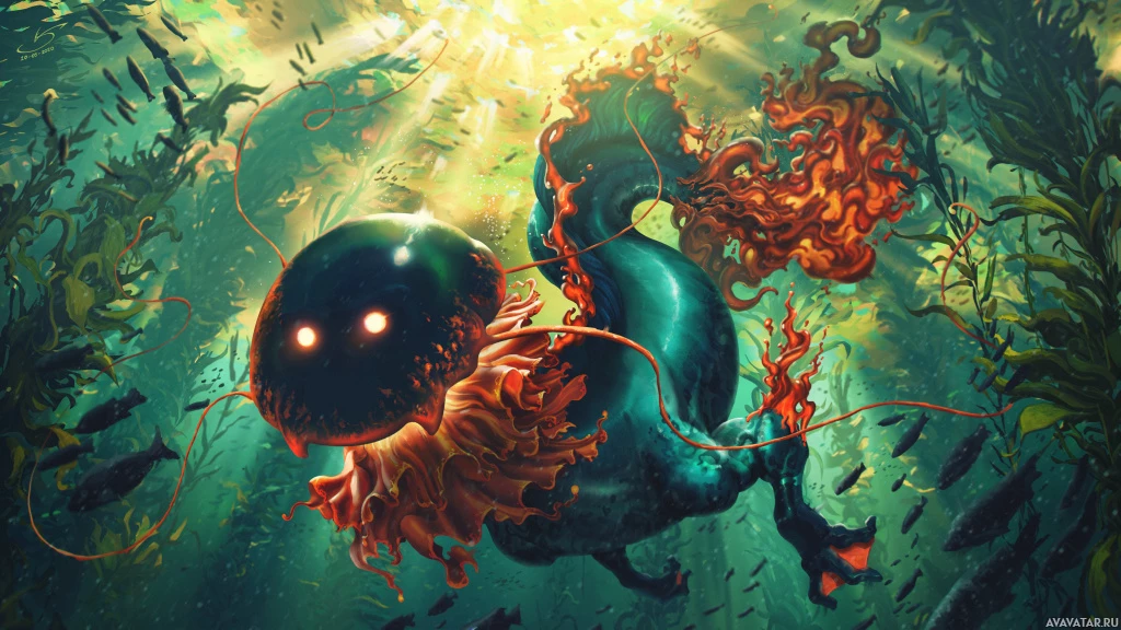 red hair, and its lower body seems to have the tail of a fish. The creature is surrounded by