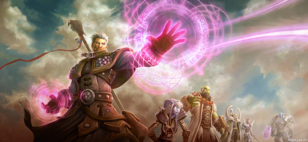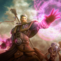 a fantasy scene with a character who appears to be a mage. The central figure, dressed in what looks like medieval or fantasy armor, is holding up their hand and casting a spell. A purple