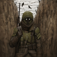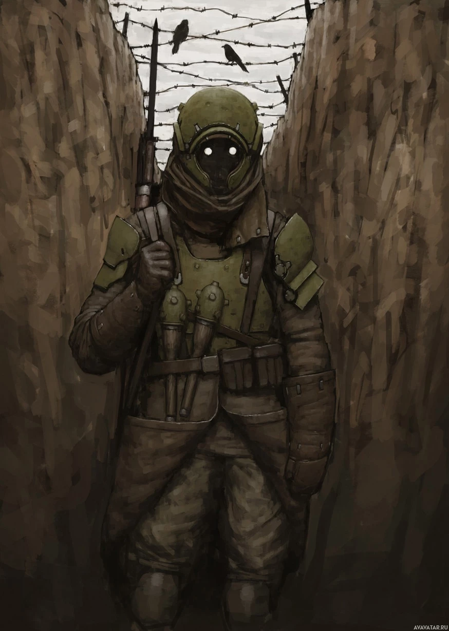 The image depicts a character dressed in military-style armor and clothing, suggesting they are portraying a soldier or a warrior. They have