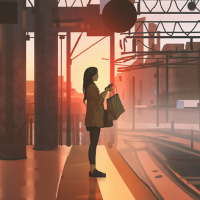 a shopping bag and looking towards the viewer, seemingly contemplating something or perhaps waiting for someone. There are also some structures that resemble train tracks leading into the distance, indicating