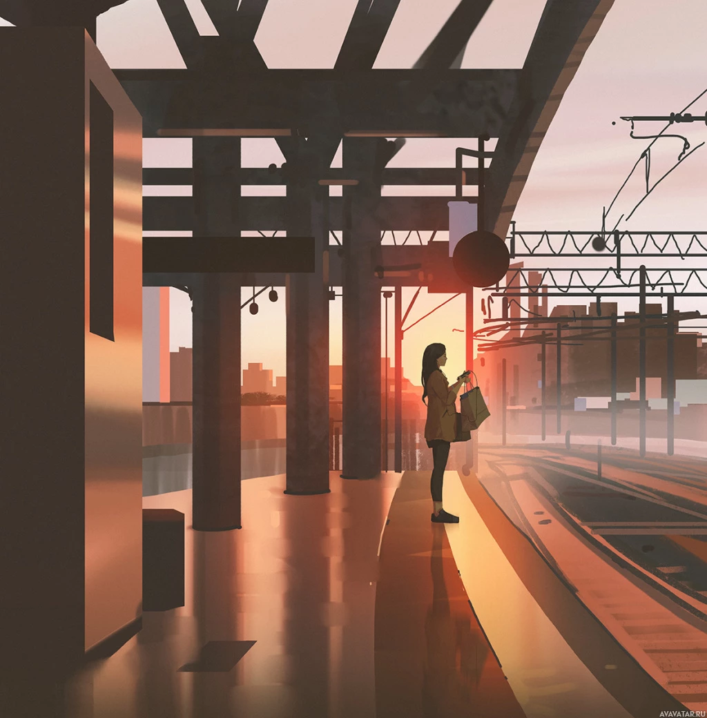 a train platform at what seems to be either dawn or dusk. The sun is low in the sky, suggesting that it might be