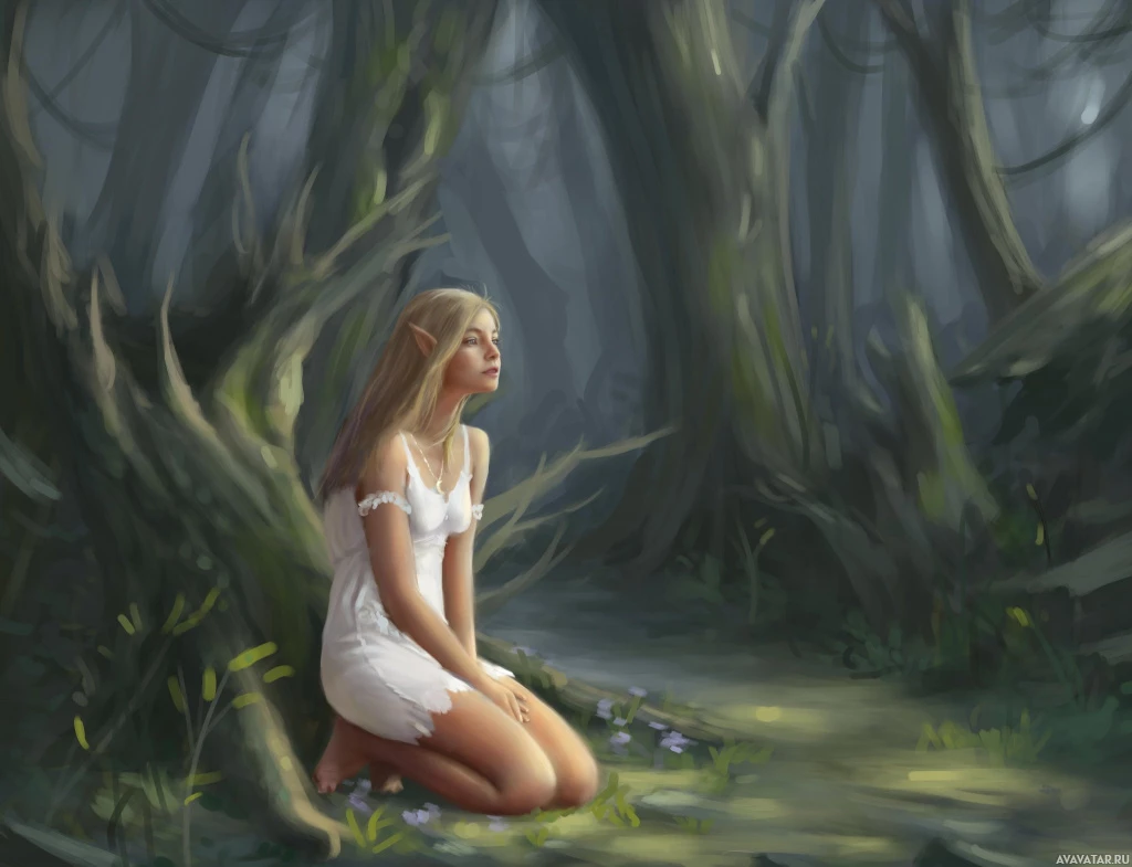 На картинке изображена фантастическая сцена, в которой эльфийка стоит на коленях на лесной подстилке. Кажется, что она смотрит на что-то вдаль, возможно, погруженная в свои мысли или наблюдающая за окрестностями. Ее наряд и обстановка создают атмосферу сборника рассказов или волшебной сказки. Задний план заполнен окутанными туманом деревьями, что придает сцене мистическую атмосферу.