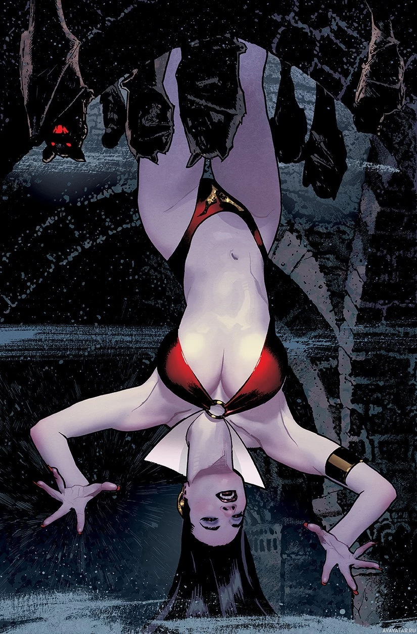 The image shows a character named Vampirella, who is depicted with vampiric features. She has long