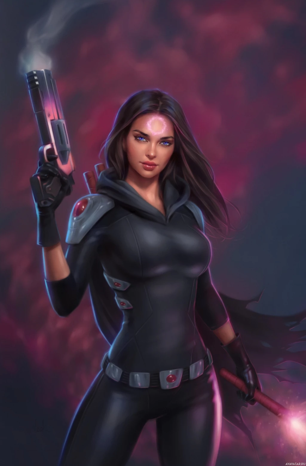 a black outfit with additional armor pieces. The background has a purple and red color scheme that suggests a dramatic or intense atmosphere. The character is depicted with
