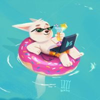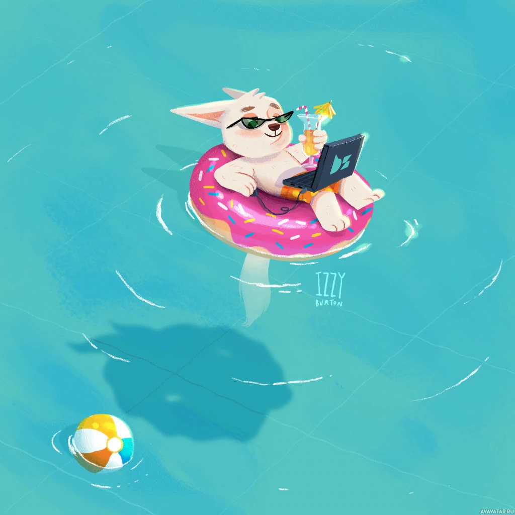 a relaxing time in a pool. The dog is wearing sunglasses and has a laptop on its lap, suggesting it might be browsing the internet or working from home while soaking up some sunlight. There's also a donut nearby, which adds to