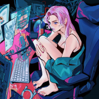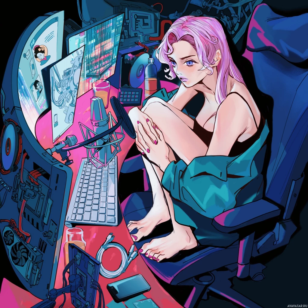 На картинке изображен анимационный персонаж с розовыми волосами, сидящий за столом перед несколькими компьютерными экранами. Судя по количеству экранов и оборудования вокруг нее, она поглощена своей работой, которая включает в себя цифровое искусство или анимацию. Эта сцена наводит на мысль, что она, возможно, студентка или художница, работающая допоздна, о чем свидетельствуют часы на заднем плане, показывающие, что уже довольно поздно.