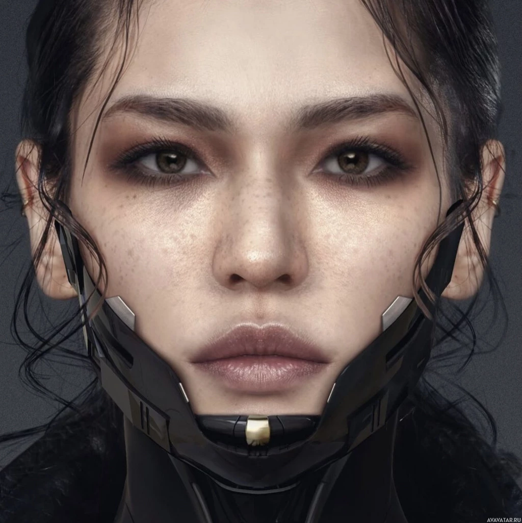brunette hair and prominent freckles on their face. They are wearing what appears to be a mechanical or cybernetic headpiece, which could suggest they are portraying a character from