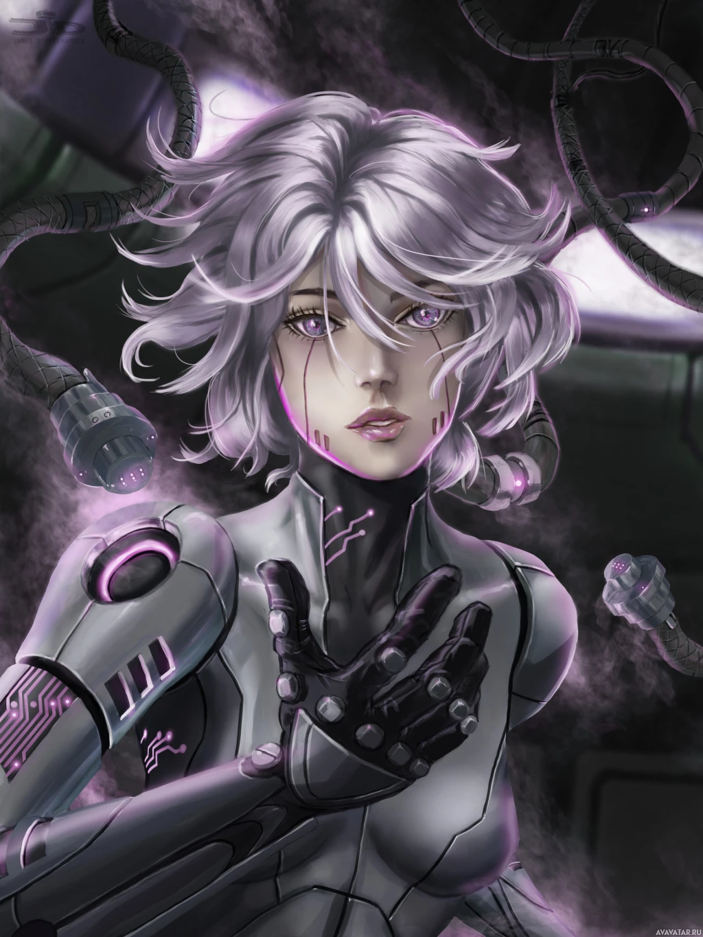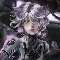 a science fiction-themed setting. She is wearing what looks like advanced cybernetic armor or